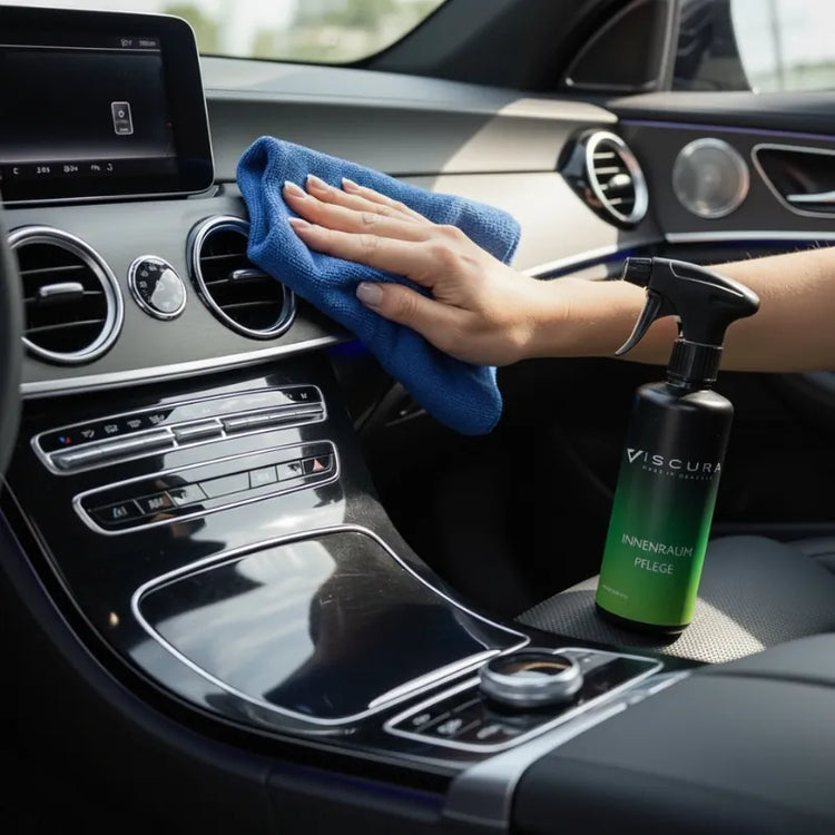 Hinweise: Nicht auf Lenkrad, Pedale oder Schaltknauf anwenden (Rutschgefahr). Vorab an unauffälliger Stelle testen. Für Displays/Glas geeigneten Reiniger nutzen.