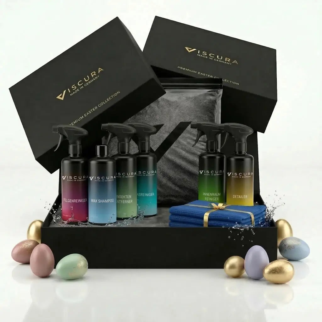Warum viele einzelne Produkte zusammensuchen, wenn du mit einer einzigen VISCURA Premium Oster Box – Glanz Edition alles bekommst, was du für ein sauberes, gepflegtes und glänzendes Fahrzeug brauchst? Die VISCURA Premium Oster Box – Glanz Edition vereint leistungsstarke Reinigungs- und Pflegeprodukte für Felgen, Lack, Glas und Innenraum in einem perfekt abgestimmten Komplettsystem.