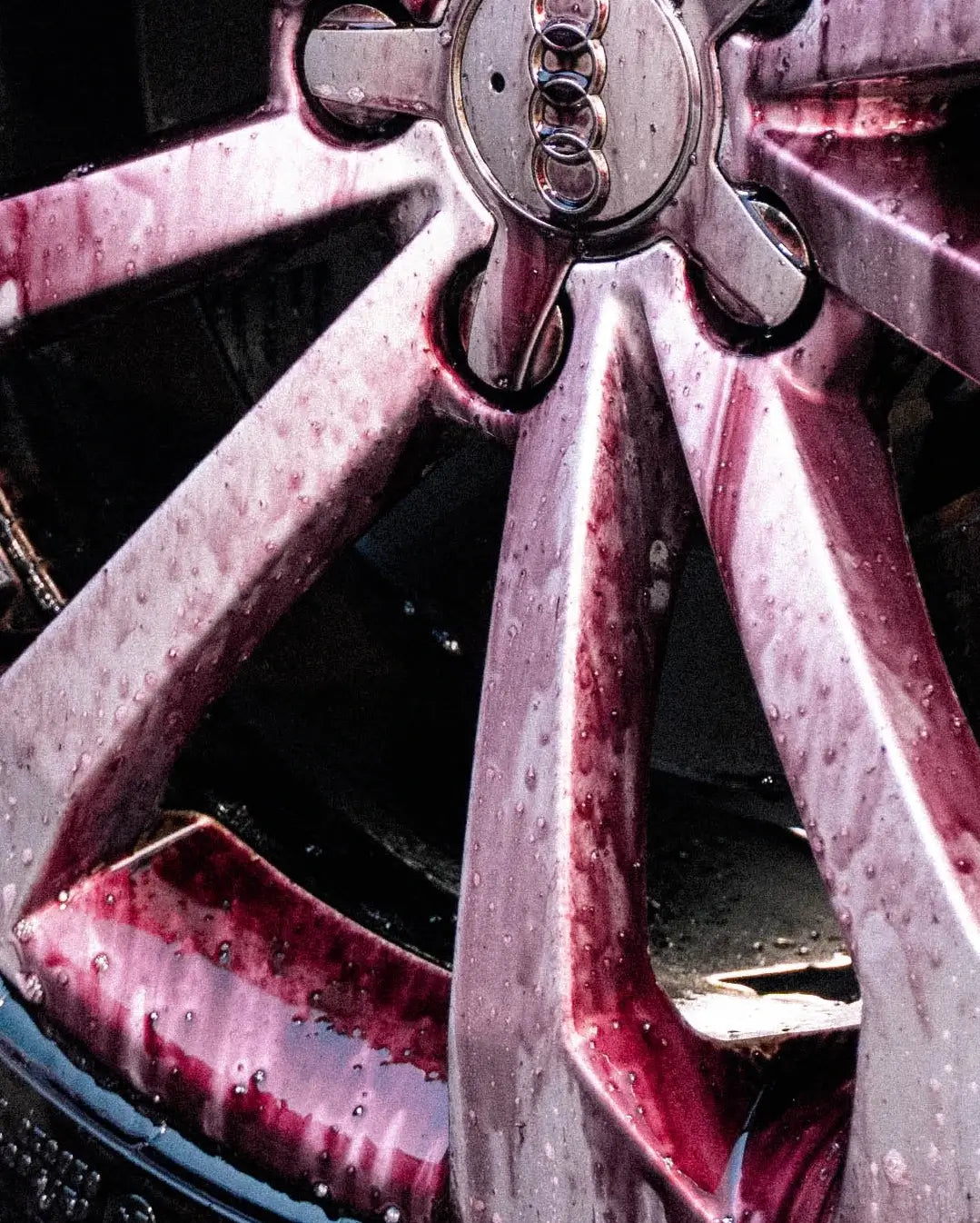 Felgen abkühlen lassen, Reiniger auf trockene Felgen sprühen und 3–6 Minuten einwirken lassen. Farbwechsel (blau → violett) zeigt die Reinigungswirkung. Danach mit Wasser oder Hochdruck gründlich abspülen. Bei Bedarf mit Bürste nacharbeiten und trockenwischen – für saubere, strahlende Felgen ohne Rückstände.